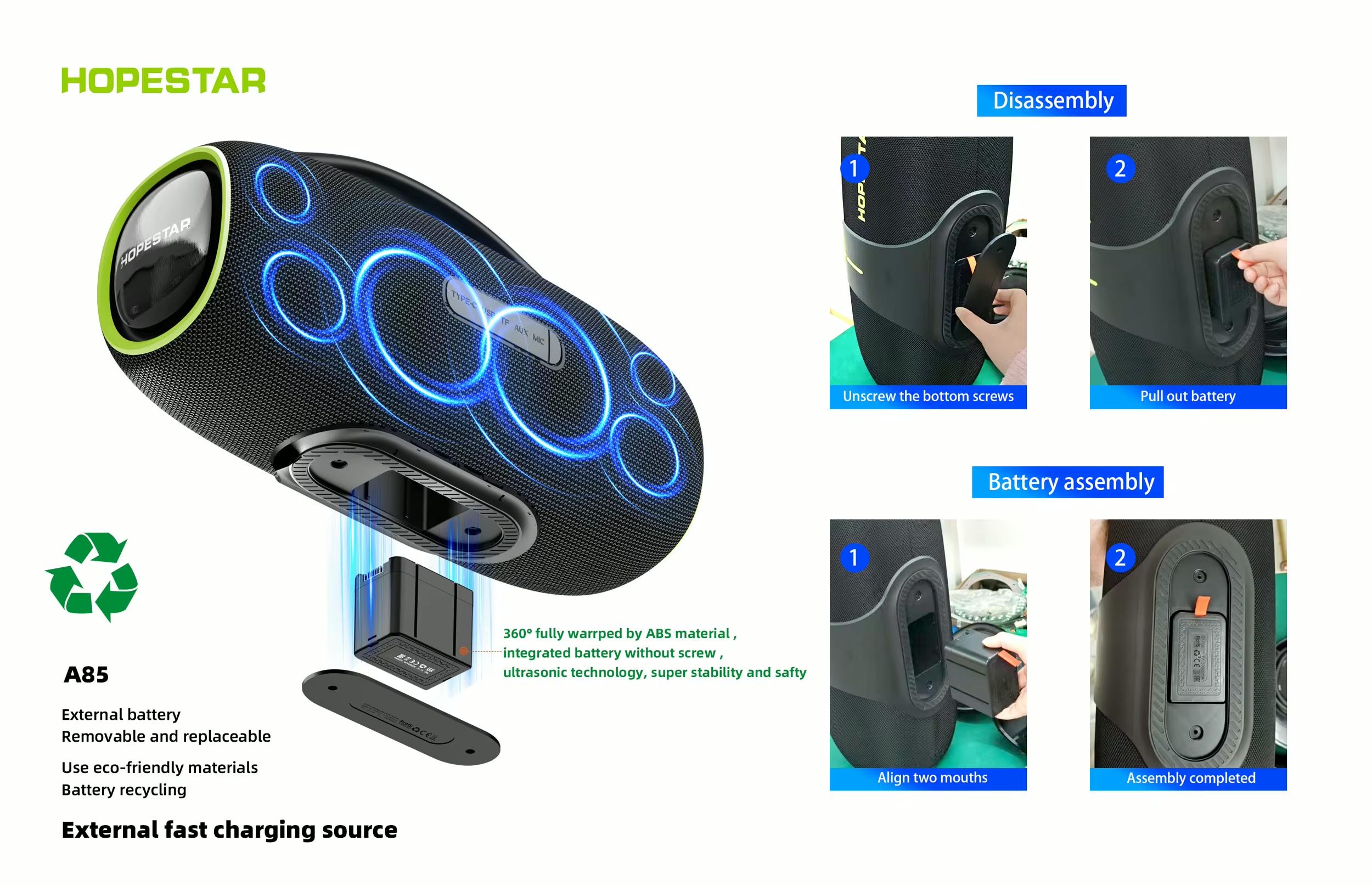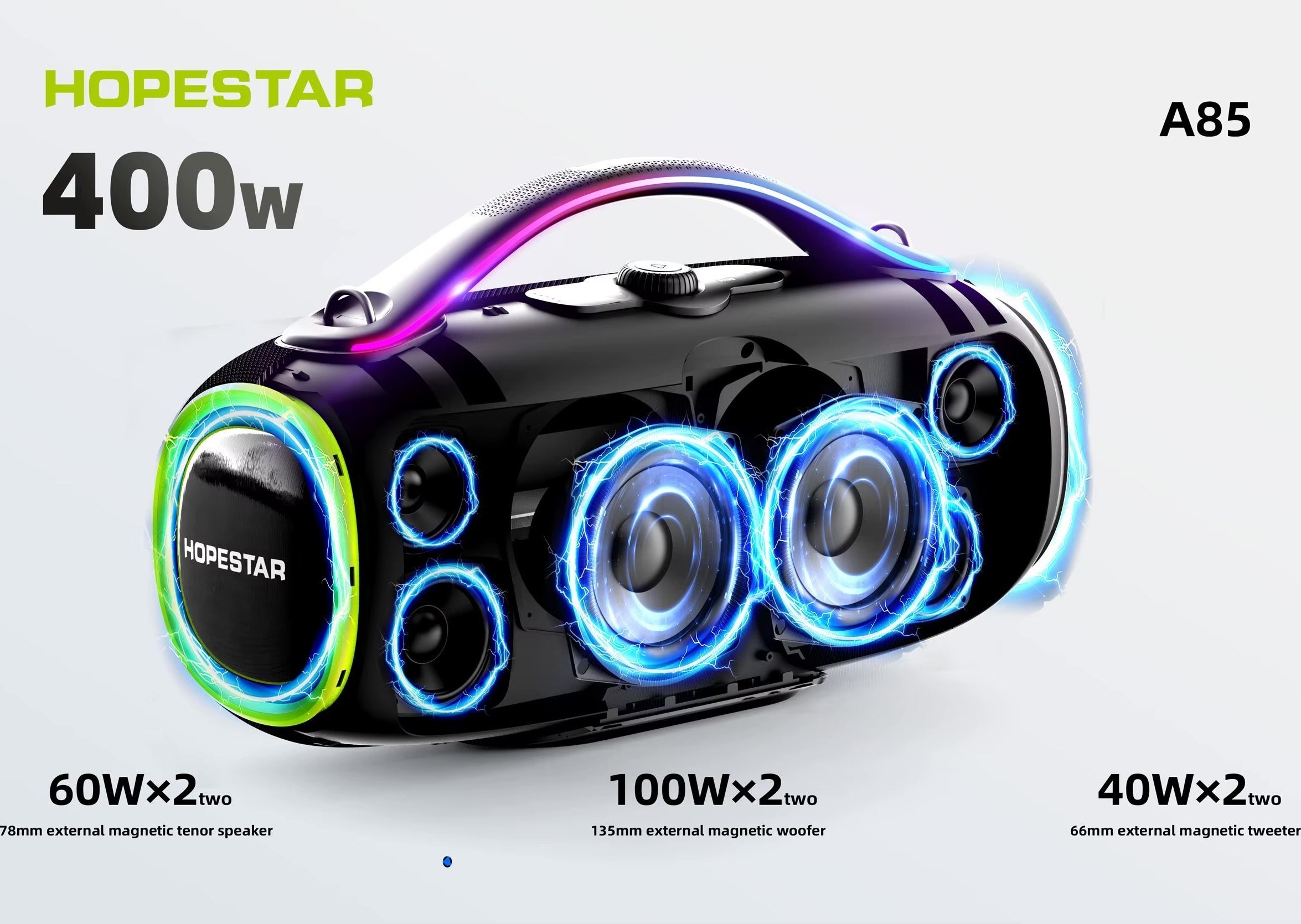 اسپیکر Hopestar A85 یک گزینه قدرتمند برای مهمانی و تفریح در فضای باز است که صدایی پرتوان و امکانات فراوان را در بدنهای قابل حمل ارائه میدهد. توان خروجی آن تا ۴۰۰ وات گزارش شده و مجهز به بلندگوهای متعدد برای تولید بیس عمیق است. این مدل دارای مقاومت IPX6 در برابر آب است، بنابراین برای استفاده در فضای باز مثل ساحل یا استخر مناسب است. از امکانات دیگر آن میتوان به ورودیهای متنوع (USB، TF، AUX)، حالت کُر (Karaoke) و افکتهای صوتی (DSP Deep Bass) اشاره کرد. با طراحی قابل حمل و امکانات چندرسانهای، Hopestar A85 همراهی ایدهآل برای مهمانی، سفر و استفاده شخصی شماست.